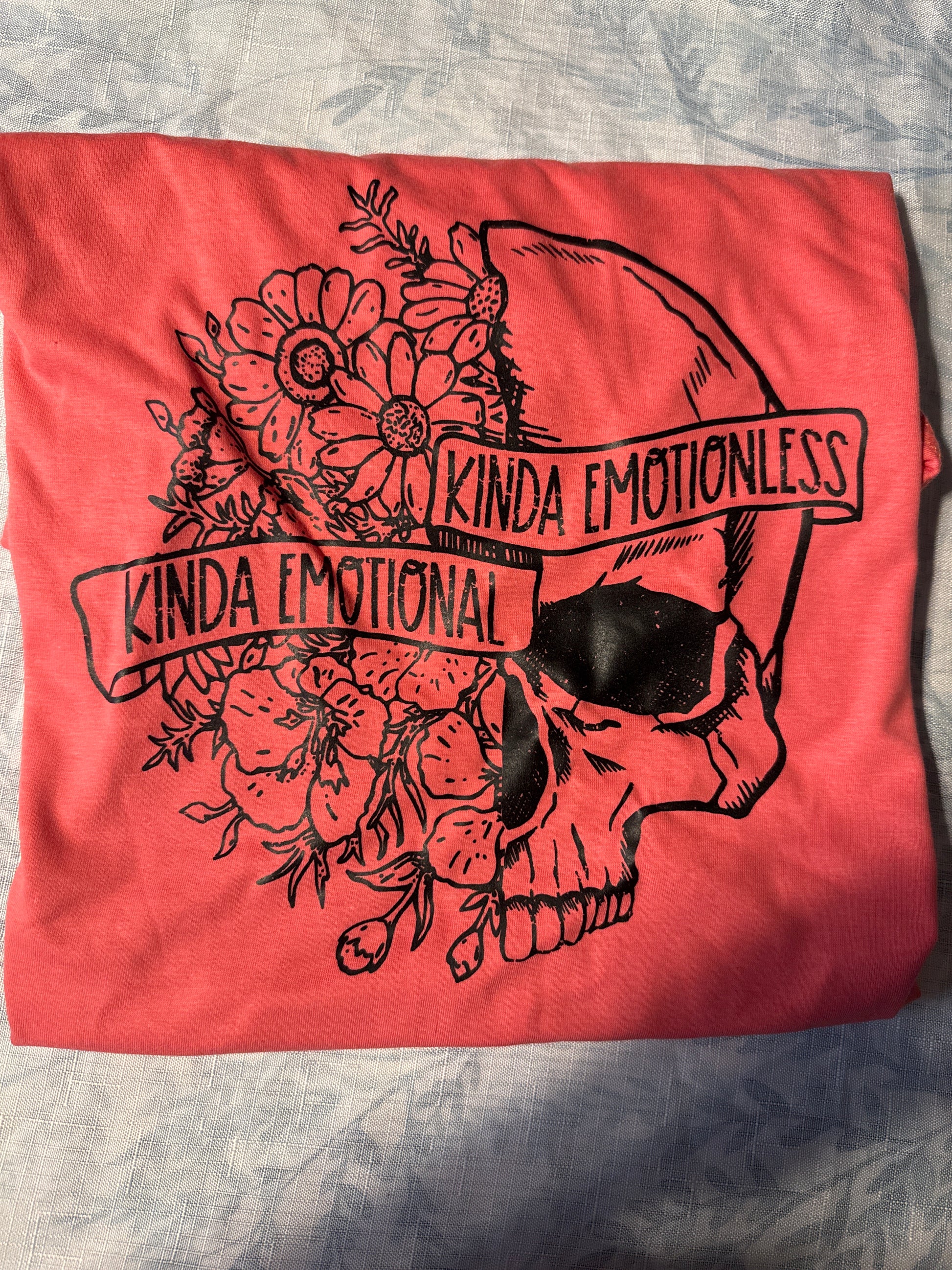This L coral colored shirt is ready to go. Please note that color may differ slightly from how it appears on your screen due to varying monitor settings.