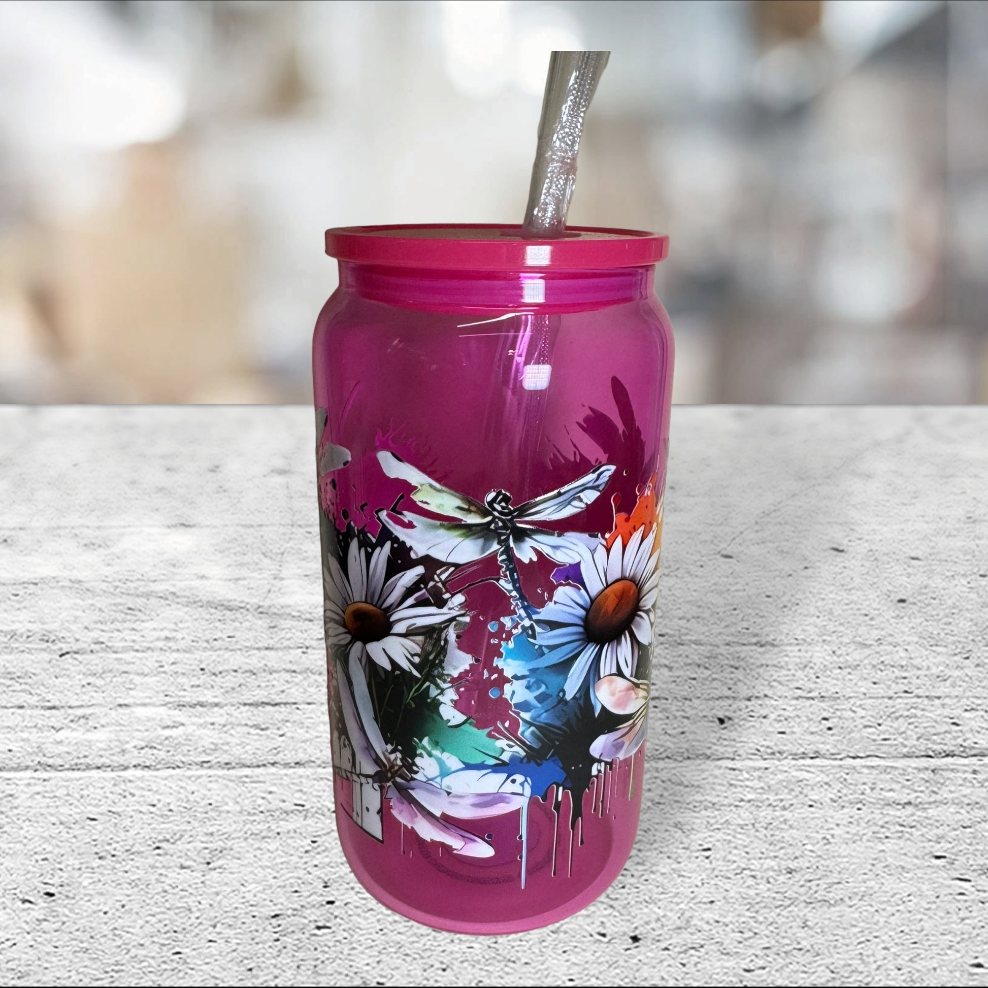This ready to ship 16 Oz. Glass Can Tumbler that is perfect for any iced coffee lover! It is made out of UVDTF.